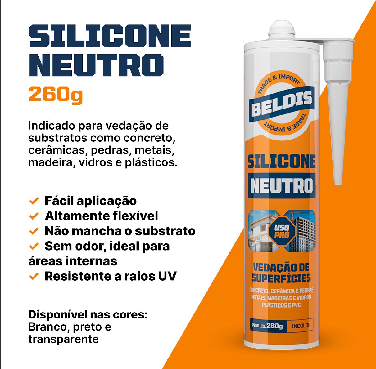 BELDIS SILICONE NEUTRO é um produto selante elástico monocomponente com características tixotrópicas e propriedades fungicidas. Desenvolvido para ter uma cura neutra em temperatura ambiente, apenas com a exposição do ar. Pode ser aplicado em diversos substratos (porosos e não porosos) com elevada resistência a variações climáticas, temperatura, umidade e raios UV.